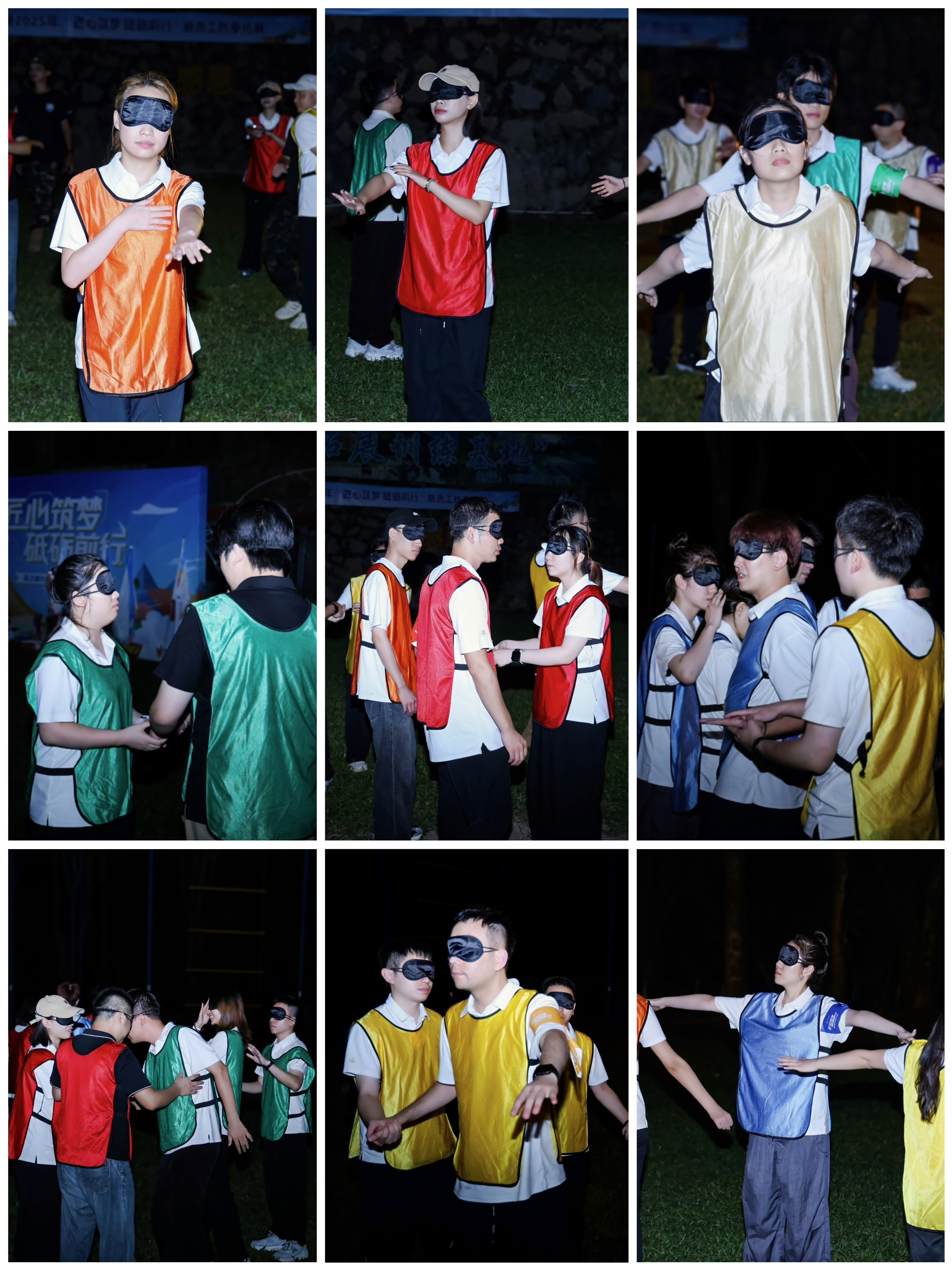 随着夜幕降临,“找回团队”项目将整场拓展推向新的高潮。队员们被蒙住双眼,在黑暗中寻找队友,每当遇到人的时候只能通过除语言外的其他方式及彼此默契来确认是否是团队同伴。游戏过程中,已经找回的队友会被教官重新拆散,团队不仅需要再次找回成员,还需要紧紧守护队友,坚定彼此的选择。那一刻,嘈杂的干扰声远去,只留下对伙伴的信任指引方向。当双手终于相握,这份在困境中建立的羁绊,让团队的凝聚力愈发坚实。随后的复盘会上,队员们围坐分享收获、梳理经验,再一次体会到团队信任与凝聚的力量。