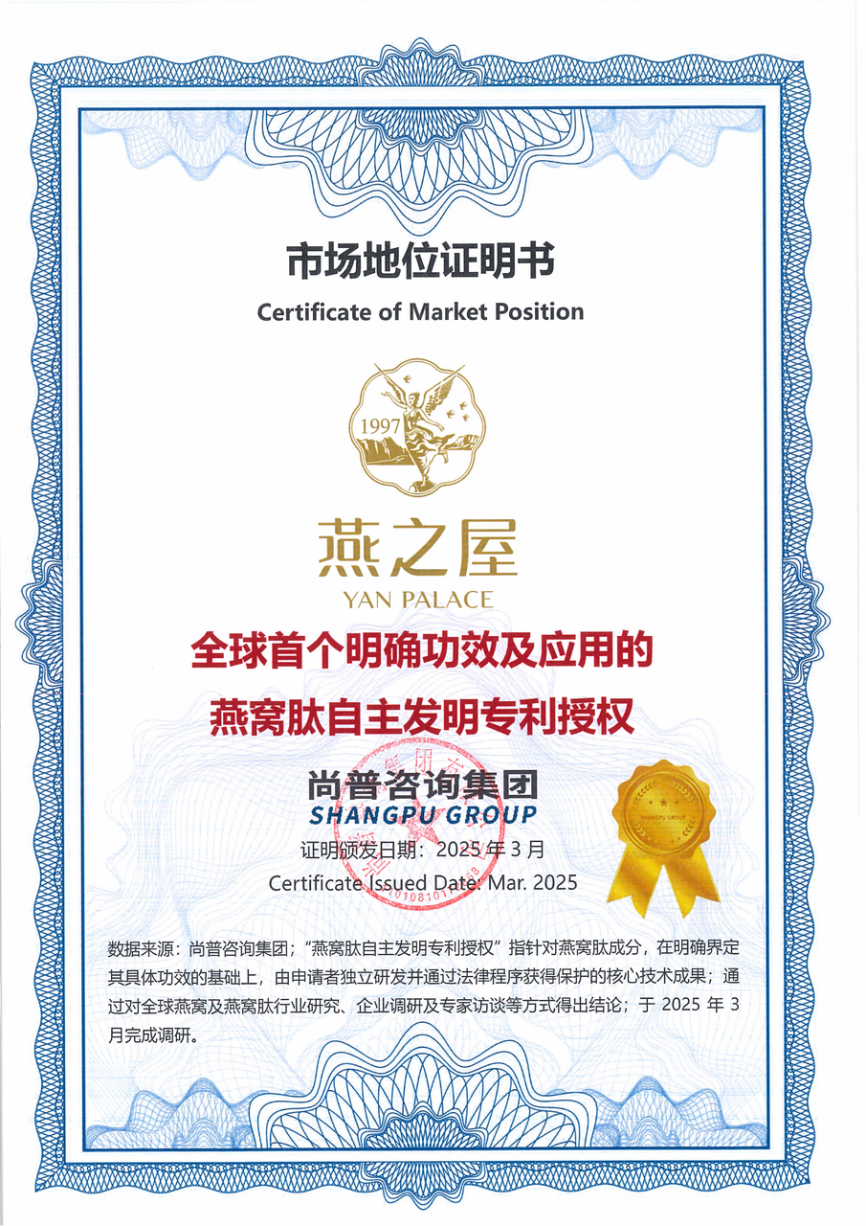 科研实力的卓越体现,在于能否攻克行业共性难题并建立核心技术标准。燕之屋在燕窝肽领域取得关键突破,于2025年经权威第三方机构尚普咨询集团专业认证,获得“全球首个明确功效及应用的燕窝肽自主发明专利授权①”市场地位证明书。该项认证所基于的核心专利《一种具有促进细胞修护、高保湿美白功效的燕窝肽制备方法及应用》(专利号:ZL 2022 11398048.3),彻底改变了传统燕窝肽“成分模糊、功效笼统”的行业局面。该专利①明确了燕窝肽的定向酶解工艺,能够将燕窝大分子蛋白质精准切割为平均分子量小于3000道尔顿(Da)的活性小分子肽段。通过此工艺制备的燕窝肽,其促进细胞修护、高效保湿及抗氧化等核心功能特性①获得了明确界定与保护,为产品的科学有效性奠定了坚实的法律与技术基石。