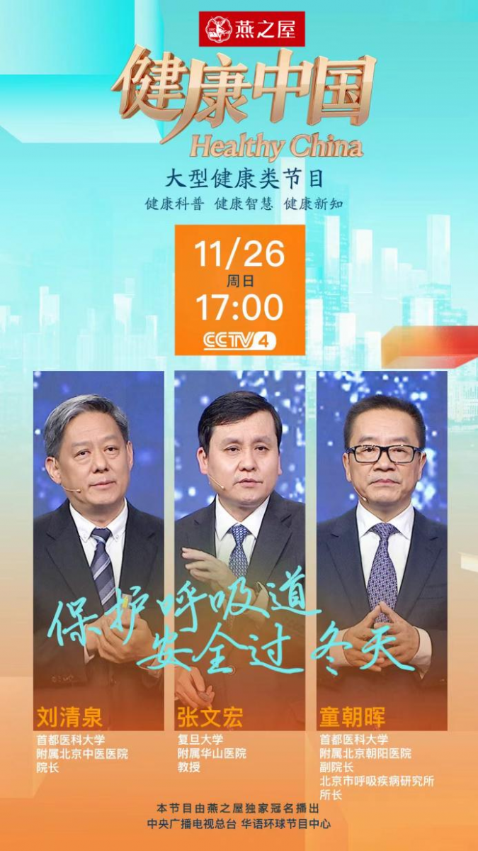 当前,随着各地陆续入冬,呼吸道疾病进入高发时期。《健康中国》节目应势播出,邀请三位权威专家粉碎呼吸道疾病谣言误解,教大家正确认识呼吸道疾病,做好健康防护,安全过冬天。由燕之屋独家冠名的CCTV-4大型健康类栏目《健康中国》于每周日晚17:00-18:00通过CCTV4亚洲版、欧洲版、美洲版面向全球播出,更多内容,欢迎锁定燕之屋独家冠名的《健康中国》。