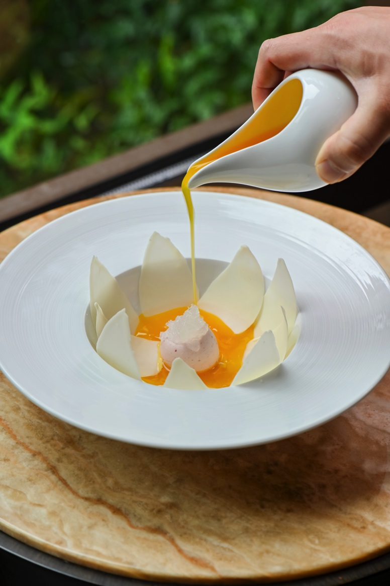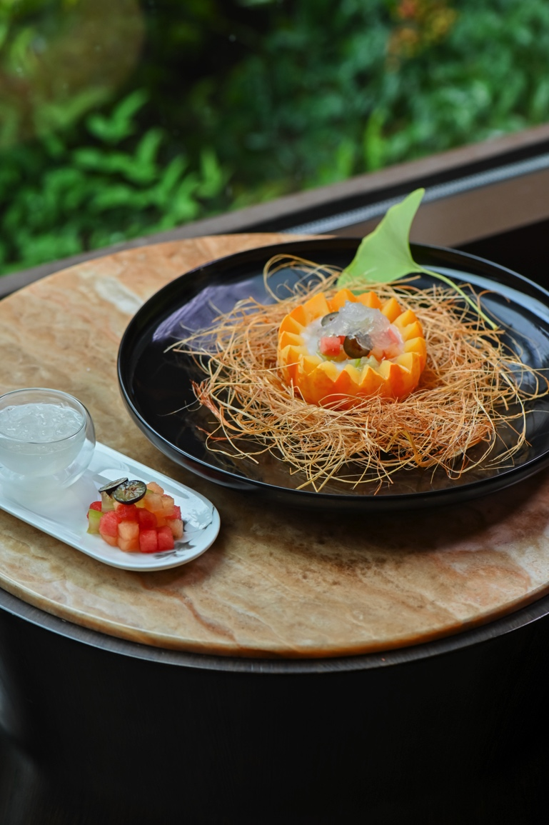 玉兰花开映燕盏,是一道展现厨艺美学的匠心之作。白巧克力制成花瓣,包裹草莓慕斯花心,在温润芒果汁液的浇淋下仿若渐次绽放。燕窝藏于花蕊,细腻口感与灵动形态共同演绎出食境合一的东方意境。