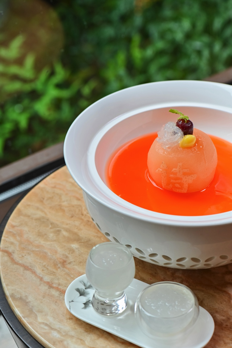 金巢玉露应燕归,取形制优美的菊瓜为器,蒸至甘软后注入香浓椰奶,缀入缤纷鲜果与晶莹燕窝。瓜体的清甜与椰韵的馥郁相融,燕丝穿梭其间,营造出丰富而和谐的味觉体验,寓意金秋归巢,温润养人。