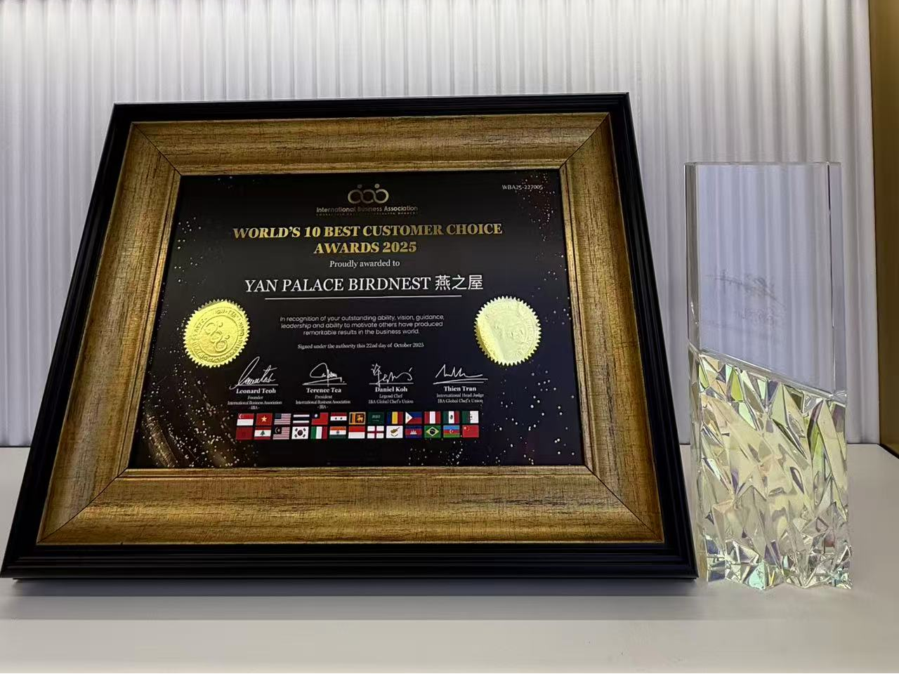 图:燕之屋荣获2025国际商业协会(IBA)大奖——全球十大最佳客户选择奖