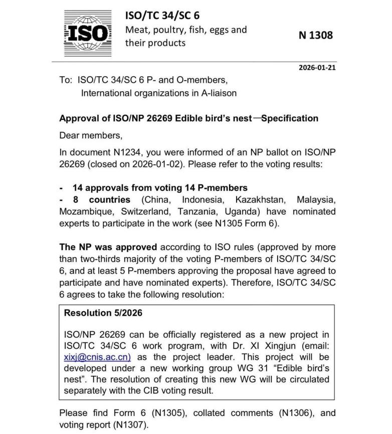 2026年1月21日,燕之屋联合中国标准化研究院主导制定的国际标准《Edible bird's nest — Specification 》(ISO/AWI 26269)成功获得国际标准化组织(ISO)立项,标志着中国企业在特色食品国际规则制定方面取得了历史性突破。