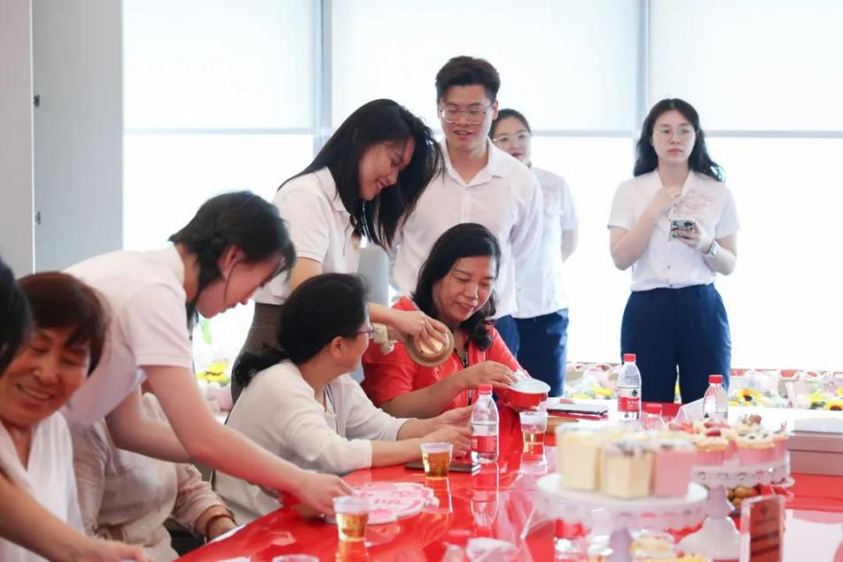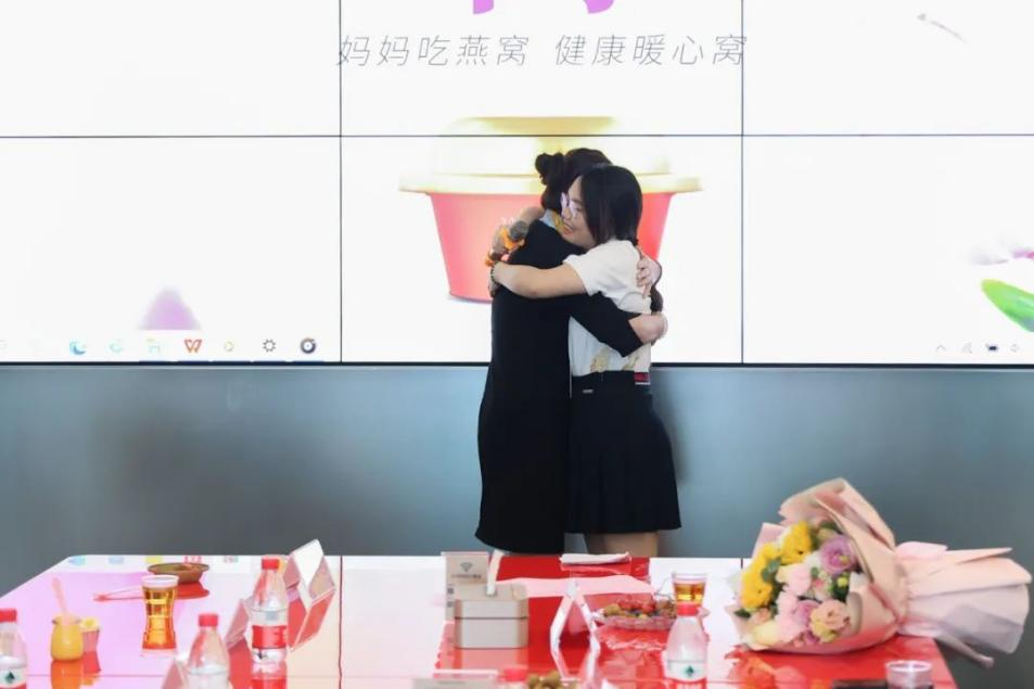 参观完后,大家来到会议室互动交流。在现场的互动环节中,员工细心地为妈妈们系上美丽的丝巾,用一方饱含温情的现代丝巾,传递内心的的柔情;紧接着,员工用一束鲜花和一张卡片,写下了平时不常说出口的“妈妈,我爱你”,向妈妈表达深深的爱意。舞台上,她们温情拥抱,舞台下,员工与妈妈深情互动,全程洋溢着满满的甜蜜和幸福。通过佩戴丝巾、递送碗燕、赠送鲜花一系列活动,感恩妈妈们的辛勤付出。