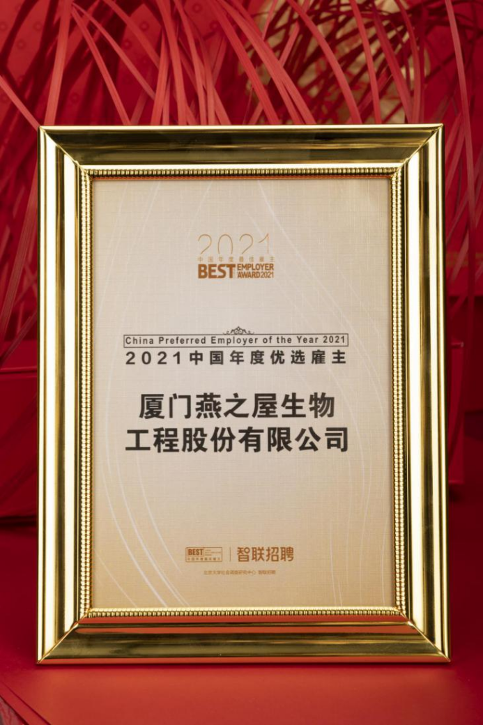 图:燕之屋荣获厦门“2021中国年度优选雇主”称号